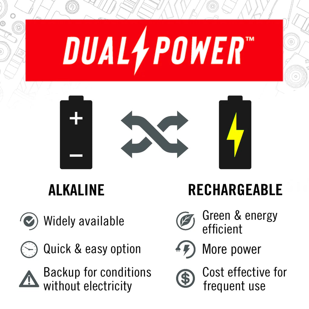 Die Dual Power-Technologie bietet höchste Flexibilität: Sie können die Lampe mit 6 x AA-Alkalibatterien (im Lieferumfang enthalten) oder einem wiederaufladbaren COAST ZITHION-X™ ZX866-Akku (separat erhältlich) betreiben.